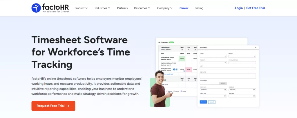 factoHR provides a streamlined, mobile-first approach to time tracking, ensuring accurate and verifiable attendance for remote and hybrid teams. The platform allows employees to punch in using advanced features like Geo-Fencing and Face Recognition, eliminating proximity-based hardware concerns. Managers utilize the comprehensive timesheet system to effortlessly track employee hours against specific projects, which automates compliance and ensures a rapid, error-free flow of data directly into payroll.